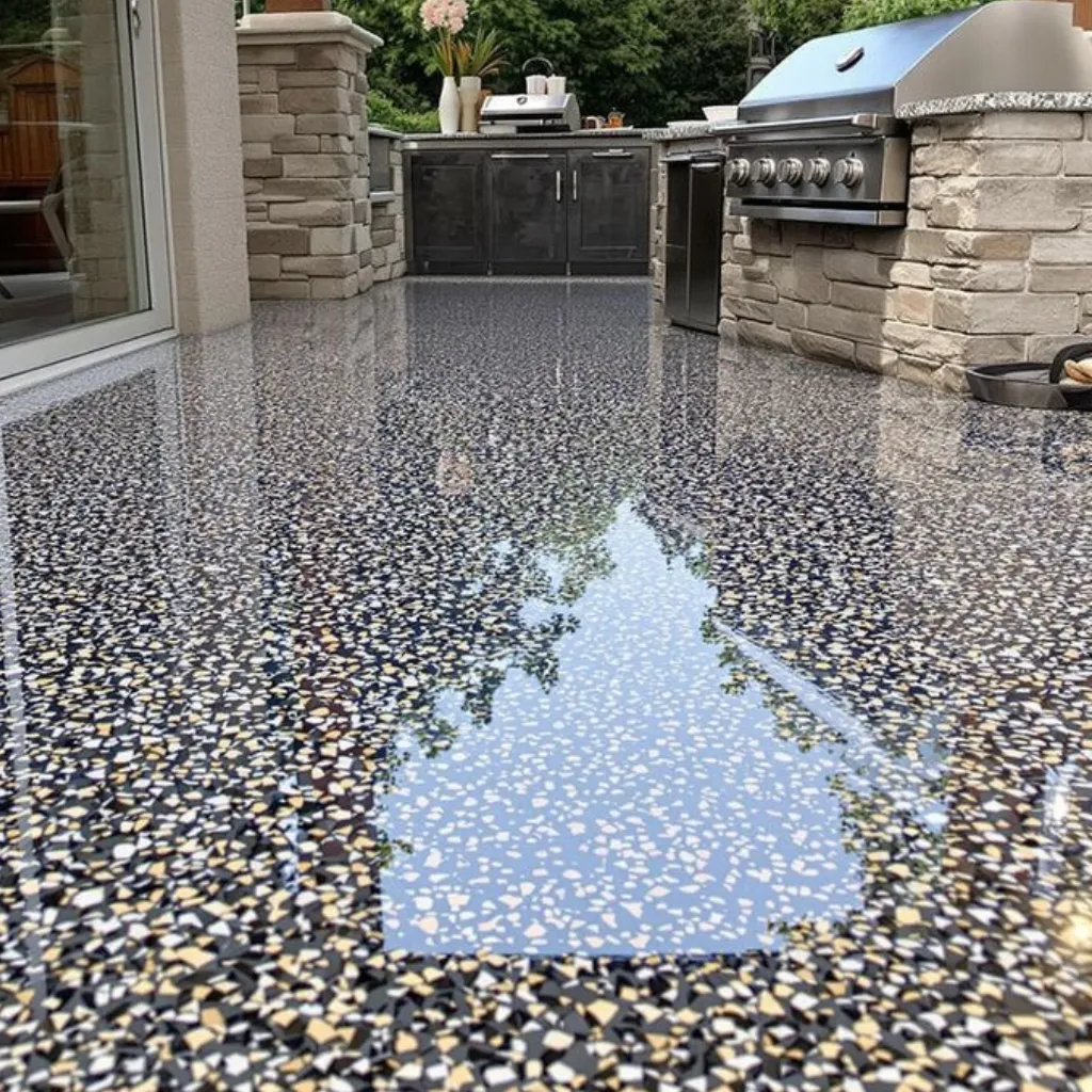 This multi-layered system consists of a concrete coating basecoat, concrete coating quartz granules, and is sealed with a protective topcoat. Extremely durable, stain, chemical, scratch and chip resistant. Weather and waterproof. It is ideal for outdoor settings and industrial/commercial settings that experience constant access to water, moisture and heavy traffic.
